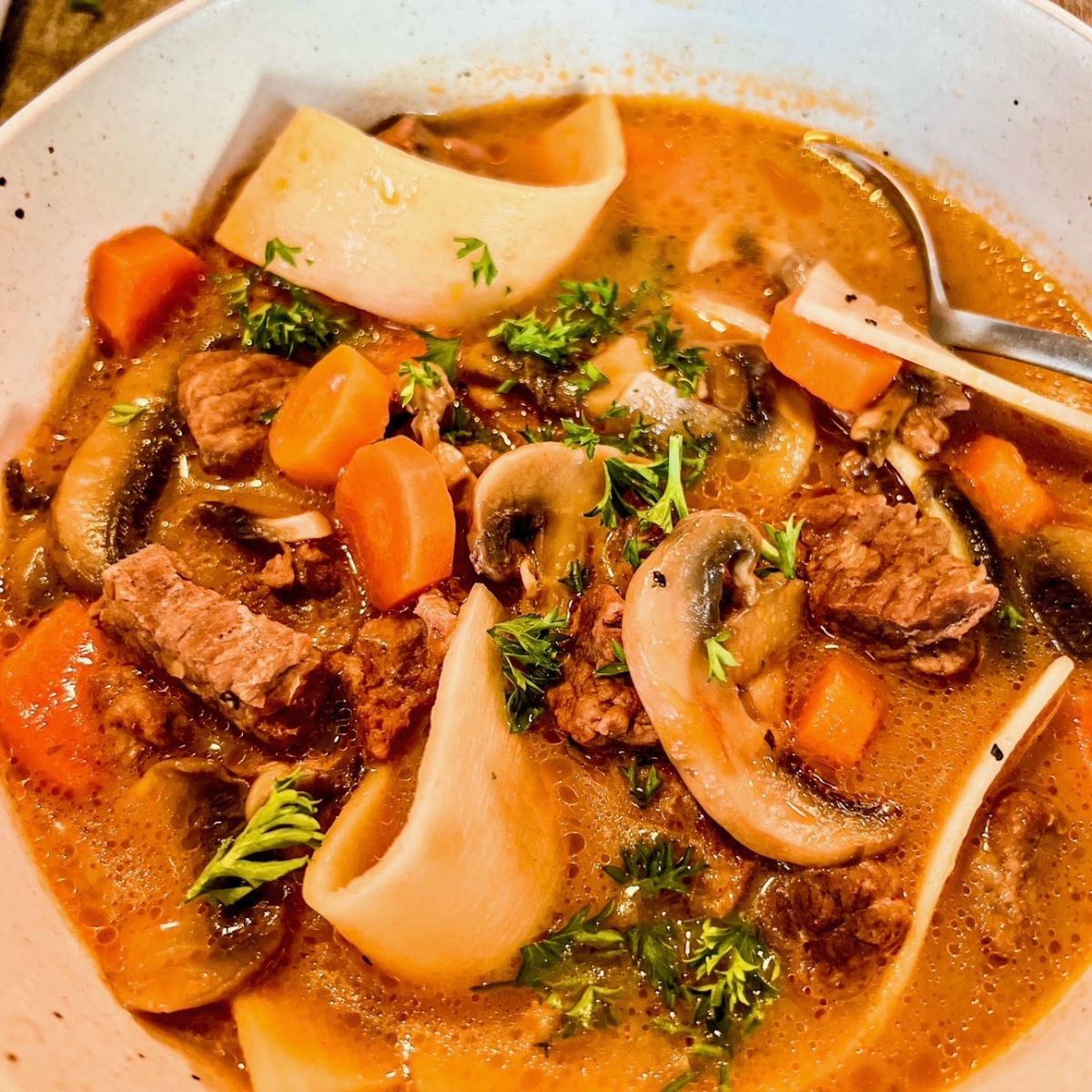 This soup brings all the savory flavors of beef stroganoff including tender bites of beef, sautéed mushrooms for that earthy umami flavor, and soft noodles all in a creamy broth.