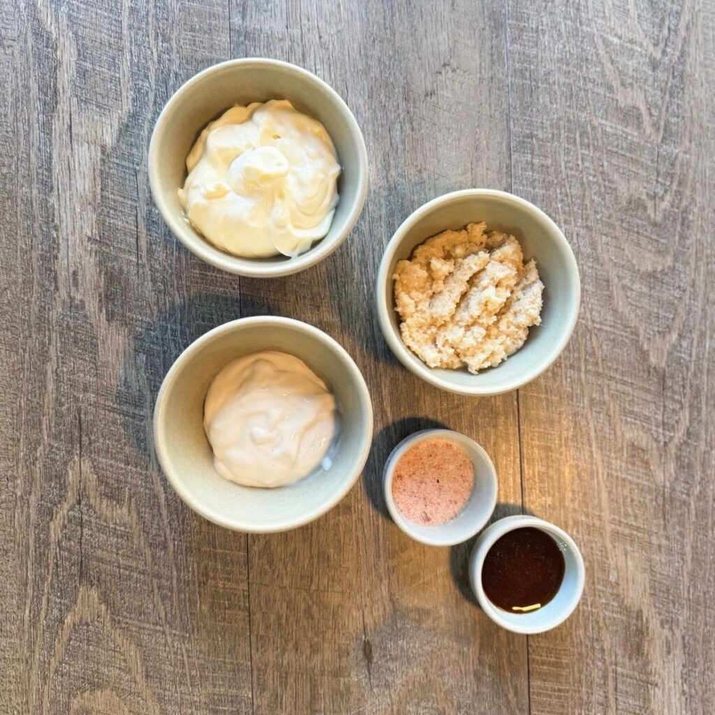 1. In a small bowl whisk together the mayonnaise, sour cream, horseradish sauce, coconut aminos, and salt till smooth and creamy.