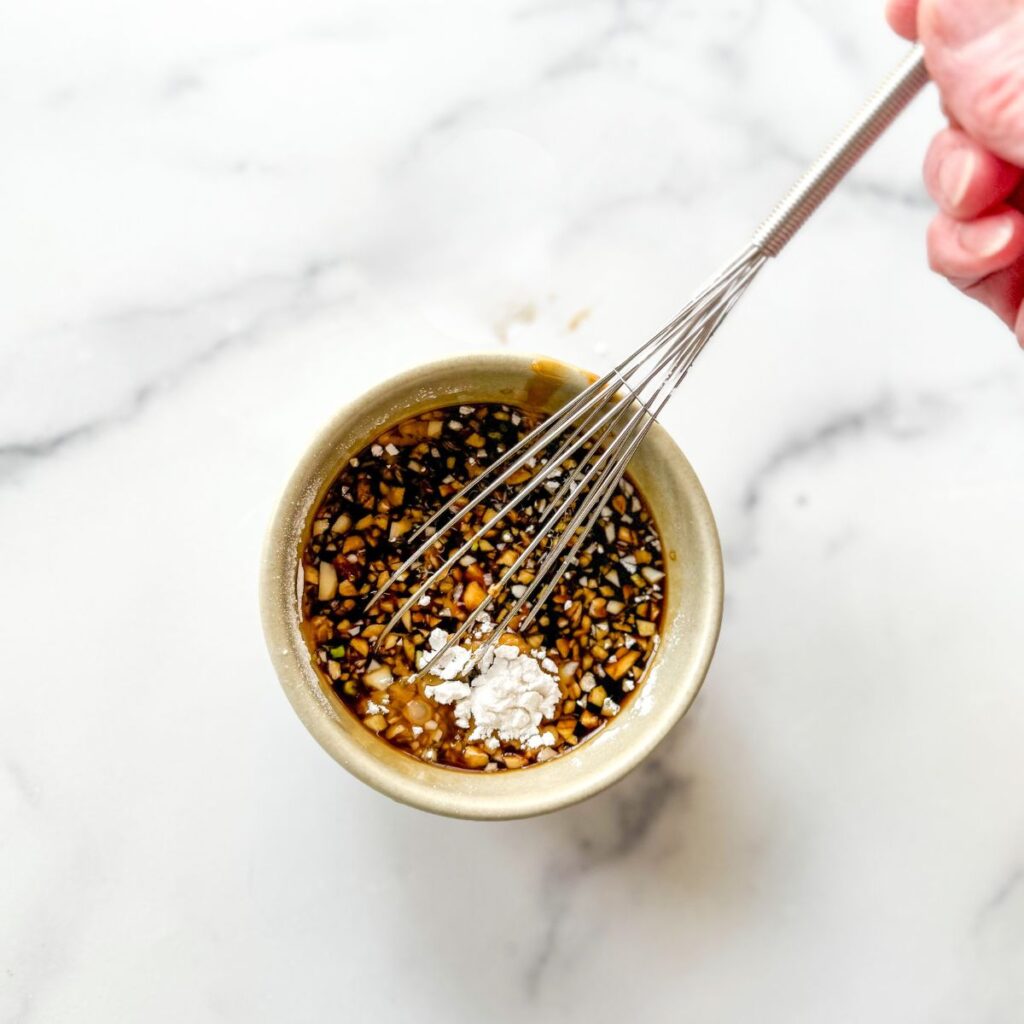 - In a small bowl whisk the coconut aminos, minced garlic and arrowroot powder and set aside.