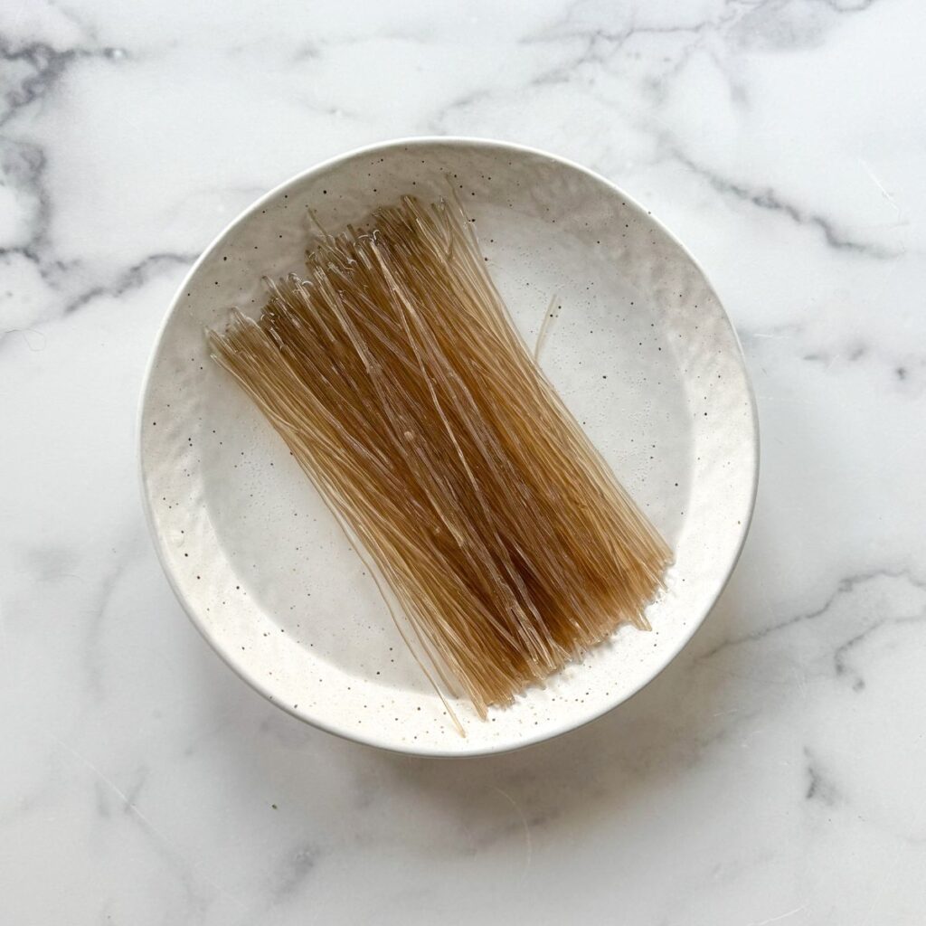 - In another bowl, place the glass noodles and carefully pour boing water to cover them and let sit for 10 minutes. Then drain the noodles.