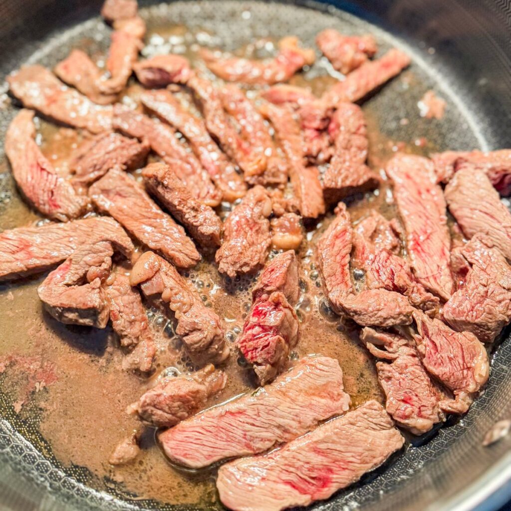 - Heat the sesame oil in a large pan on medium high and cook the steak strips for 2 minutes each side. Move to a plate.