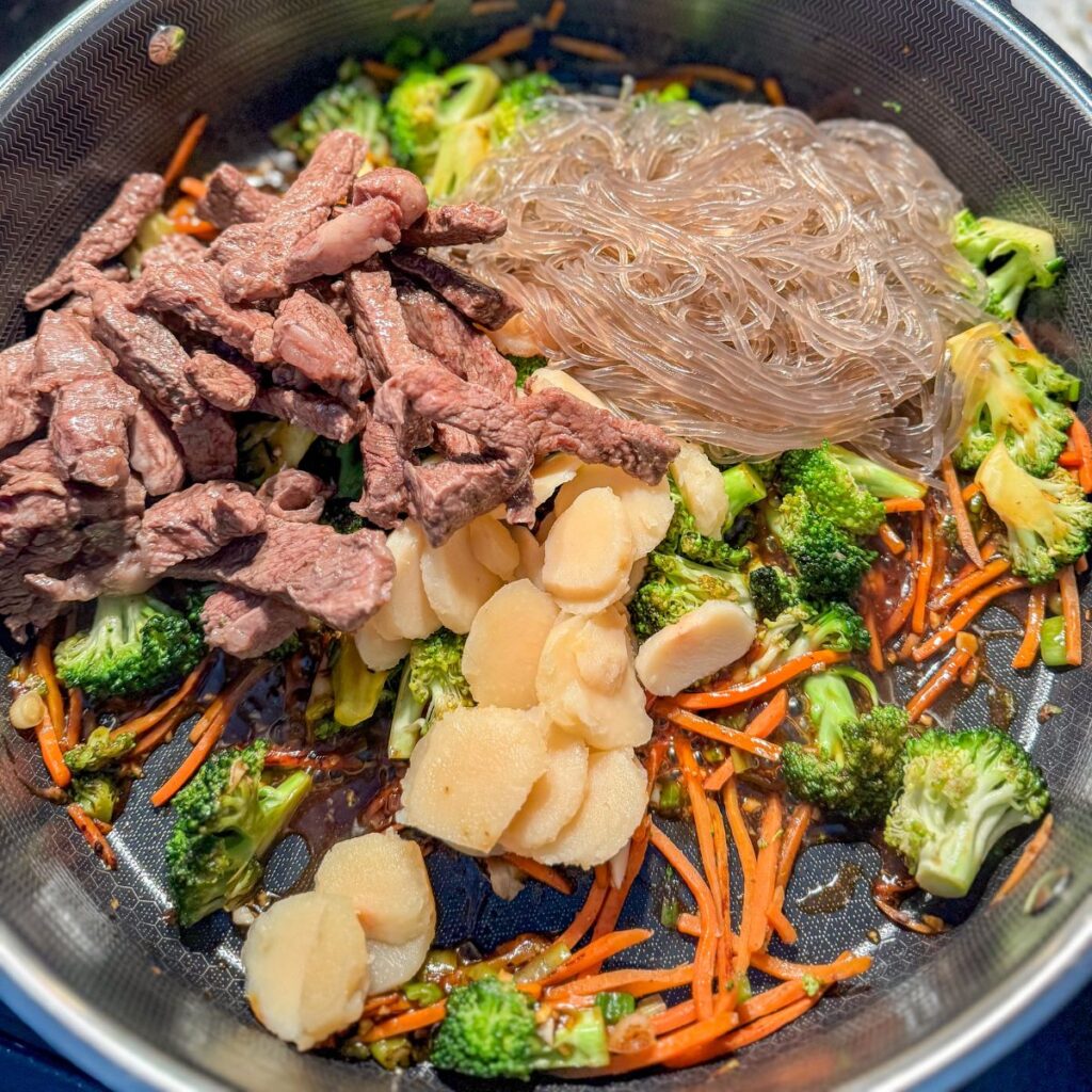 - Add the glass noodles, steak slices, water chestnuts, rice vinegar, salt and pepper to the pan, stirring to coat with the sauce.