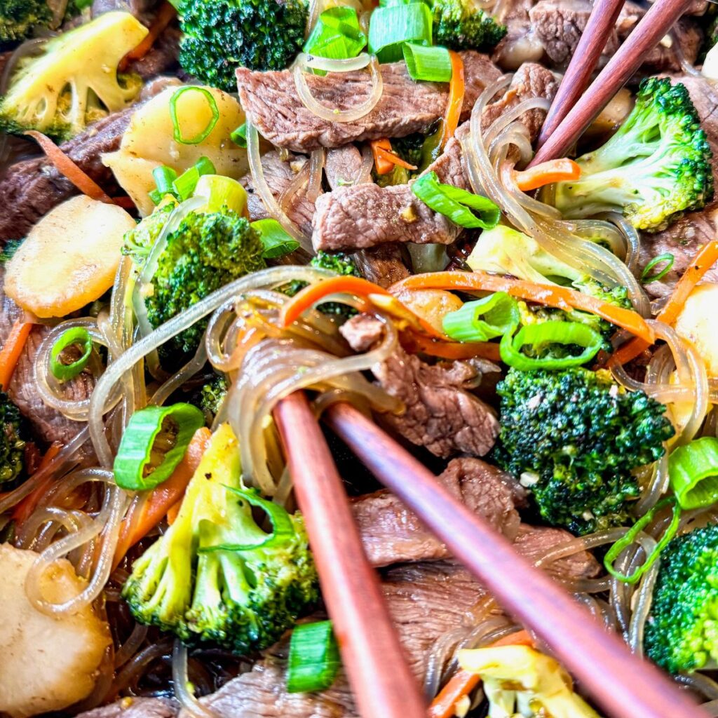 Easy Beef Lo Mein is a quick, one pan meal with tender beef strips, glass noodles, and crisp vegetables tossed in a savory coconut aminos sauce. Better than takeout, using simple ingredients, ready in 30 minutes for the family to devour! It’s Paleo and Whole30 friendly too. Try some of our other healthy takeout meals like Teriyaki Chicken Stir Fry or Gluten Free Fried Rice with Shrimp.