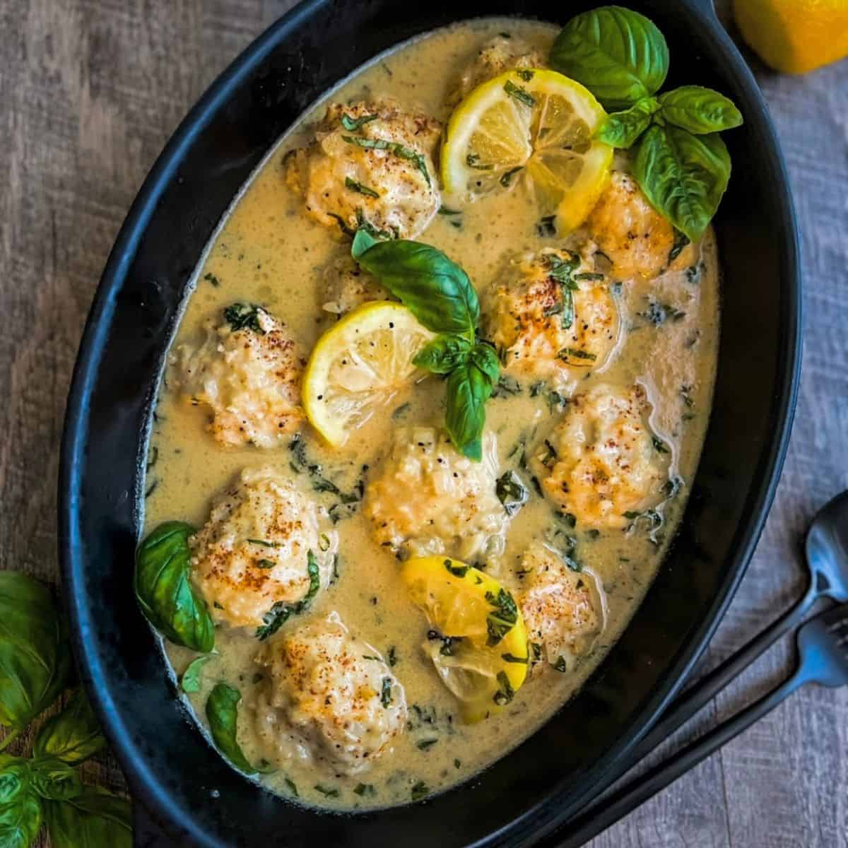 Oval black dish with meatballs in creamy lemon herb sauce, garnished with lemon slices and fresh basil leaves, on a wooden table. Spoons and loose basil leaves are nearby.