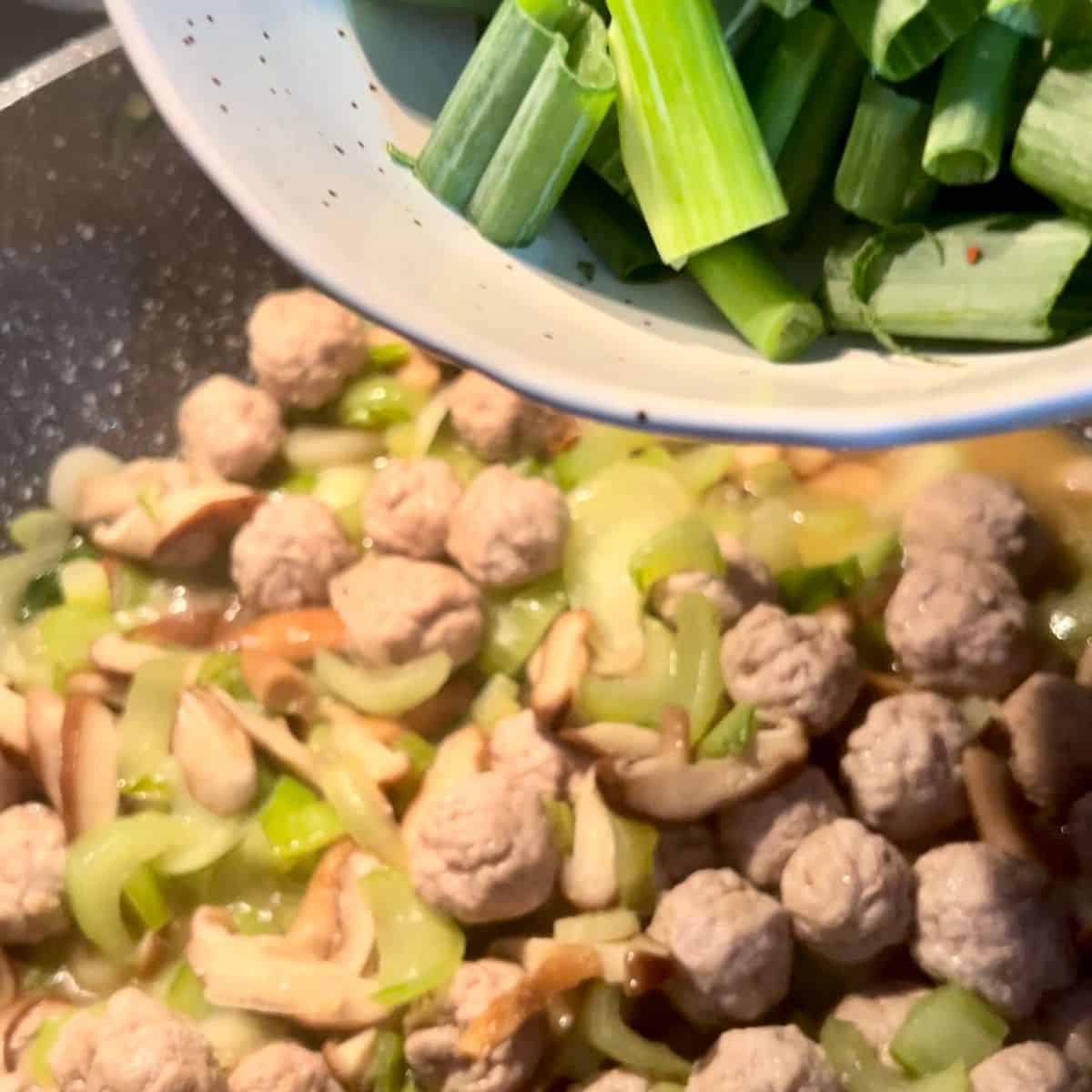 Adding the green onions: I prefer slicing the white part thinly and cutting the green part into 1-inch pieces.
