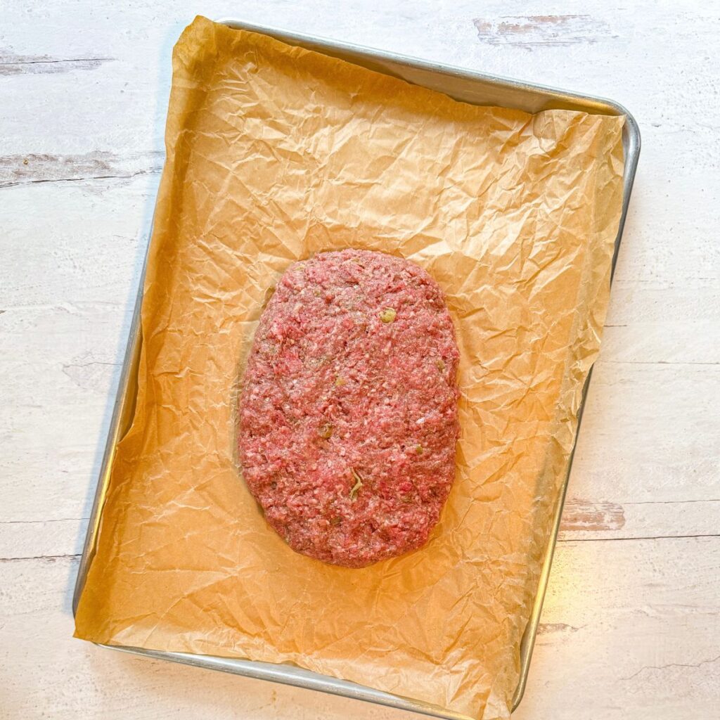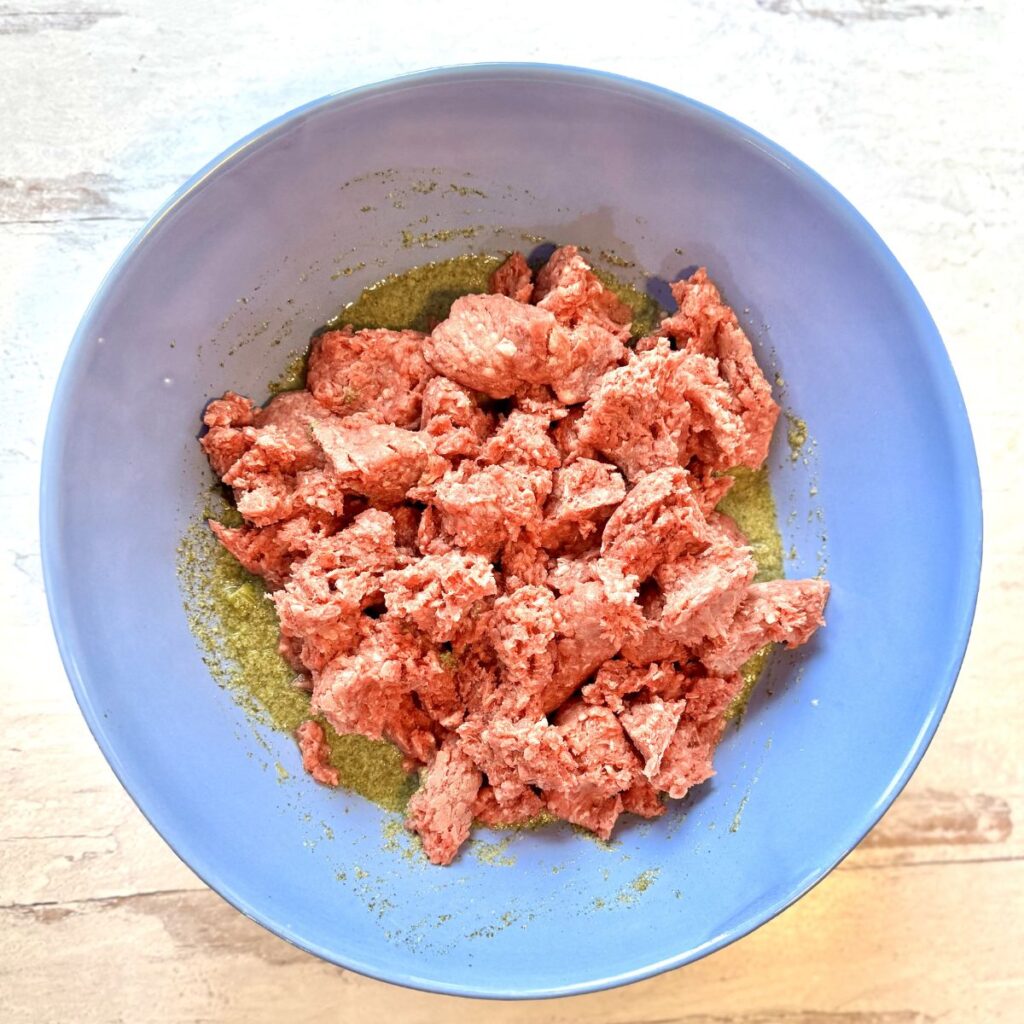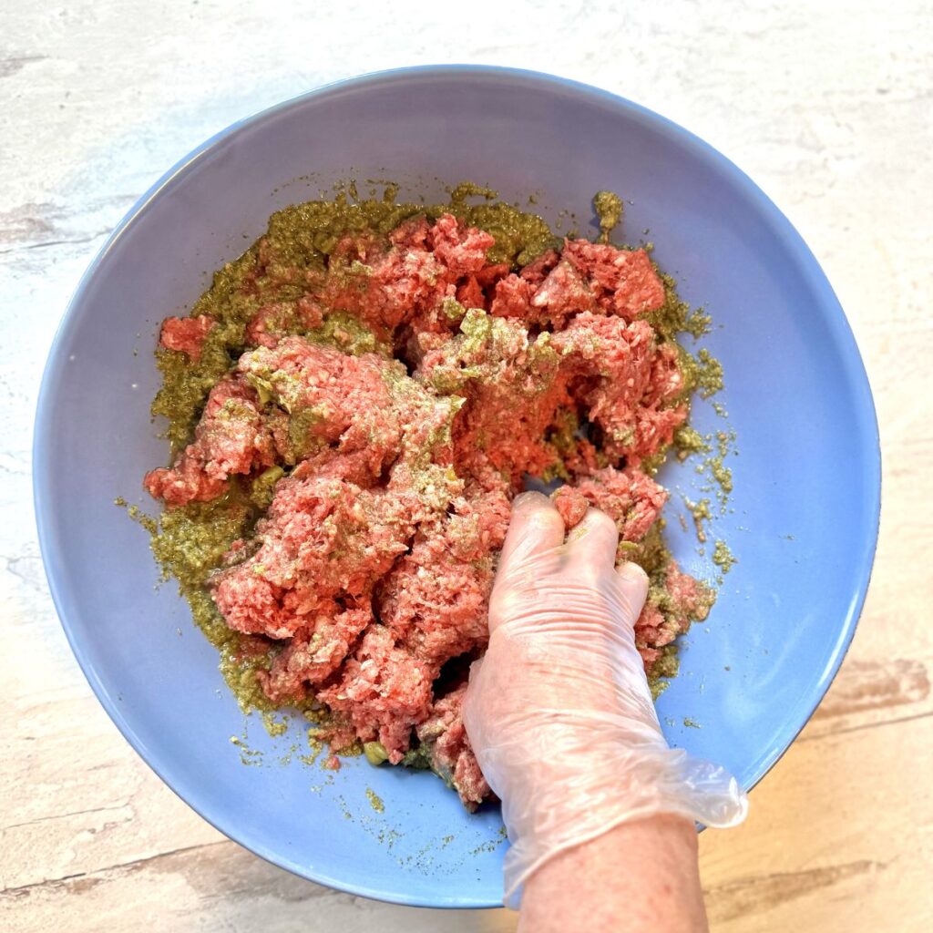 3. Add the ground beef and mix with your hands, wearing rubber gloves, till combined. Being careful not to over mix.