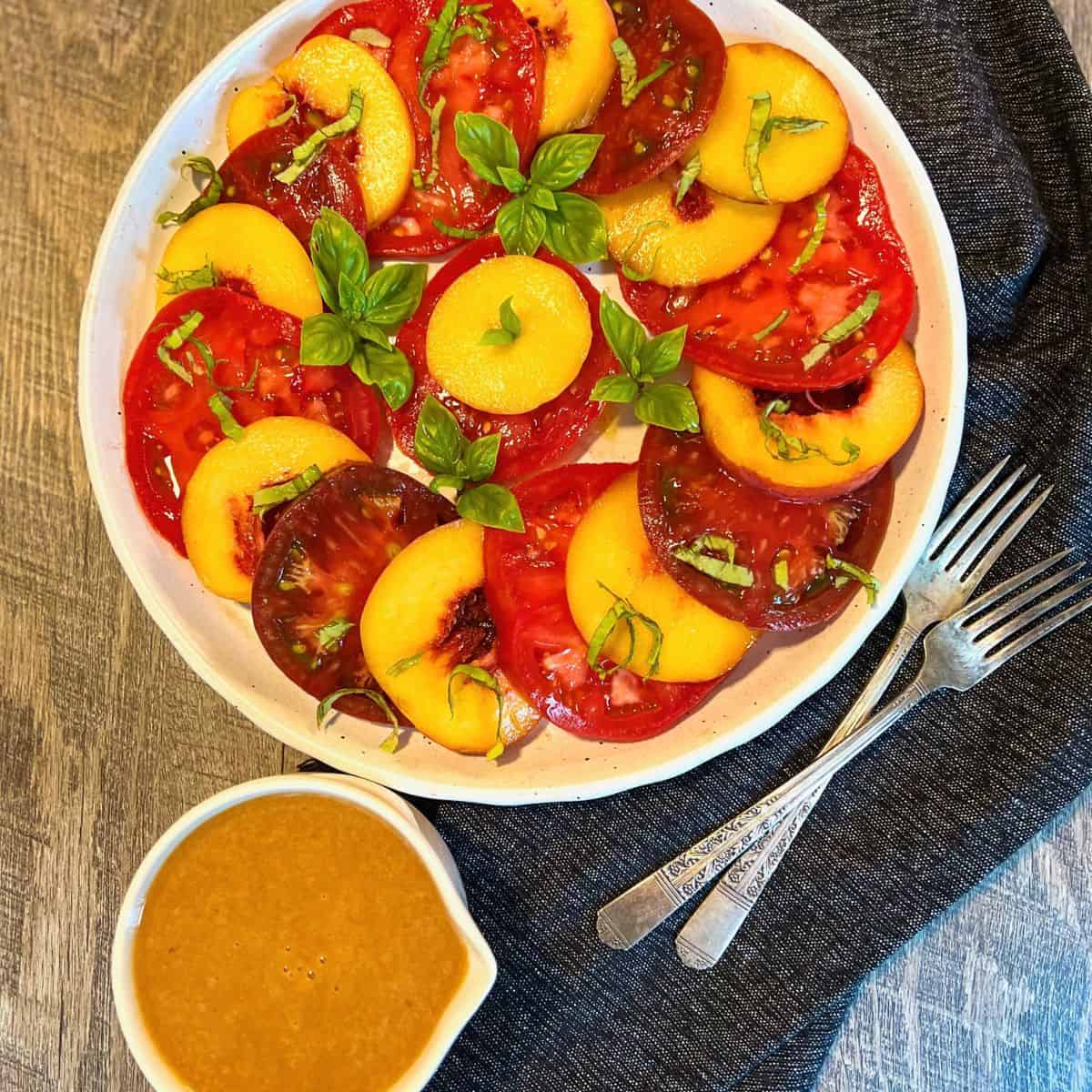 Peach Vinaigrette is sweet and tangy especially delicious during peach season. I like to serve this drizzled over an heirloom tomato and peach salad with fresh basil! Watch it disappear! If you enjoy homemade dressings like we do you may like this Orange Poppyseed Dressing too!
