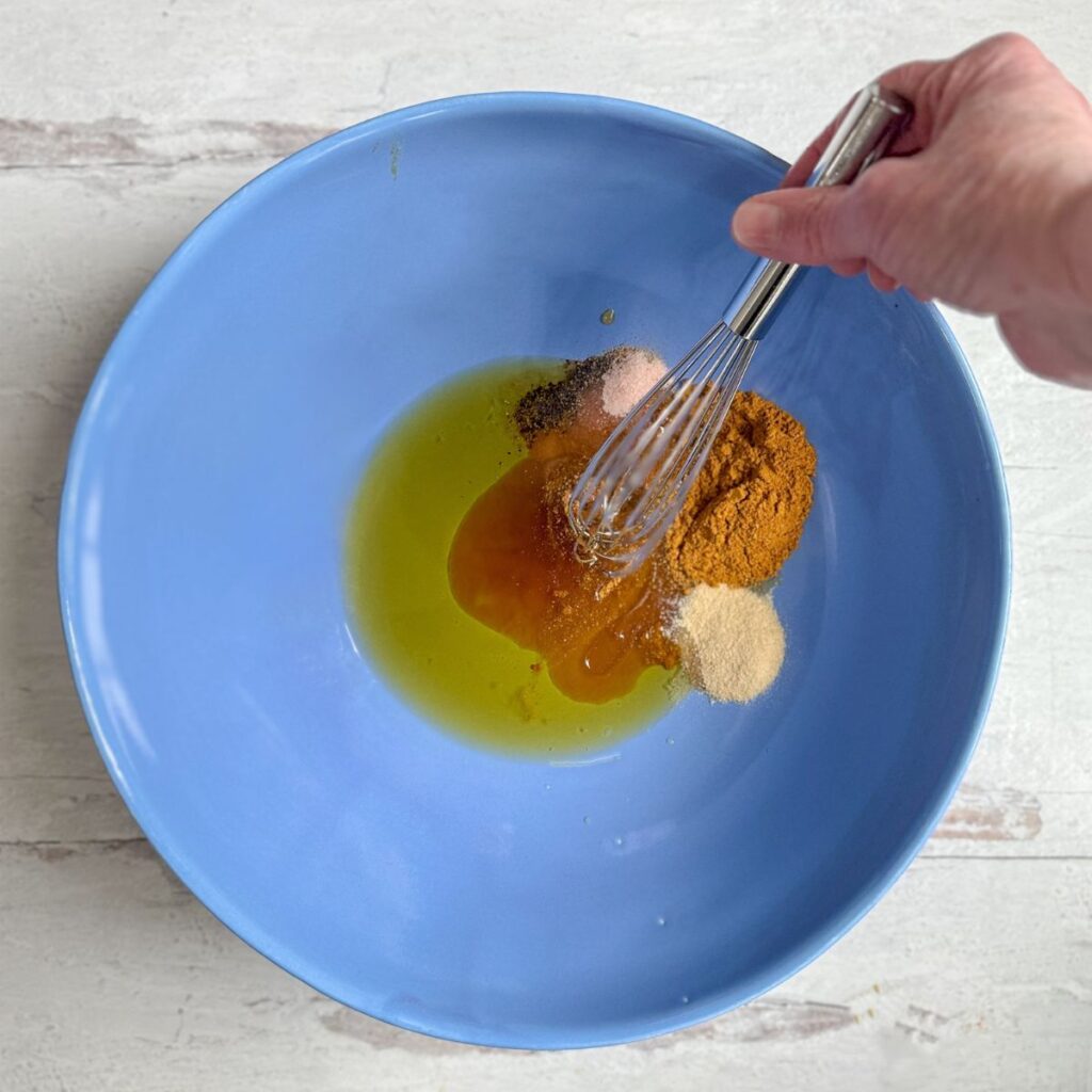 3. Whisk in a large bowl, honey, olive oil, curry, garlic powder, salt and pepper.
