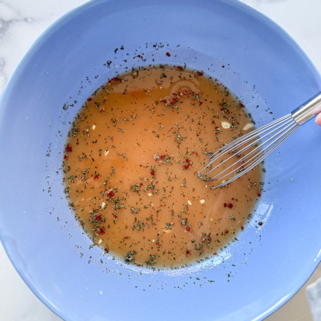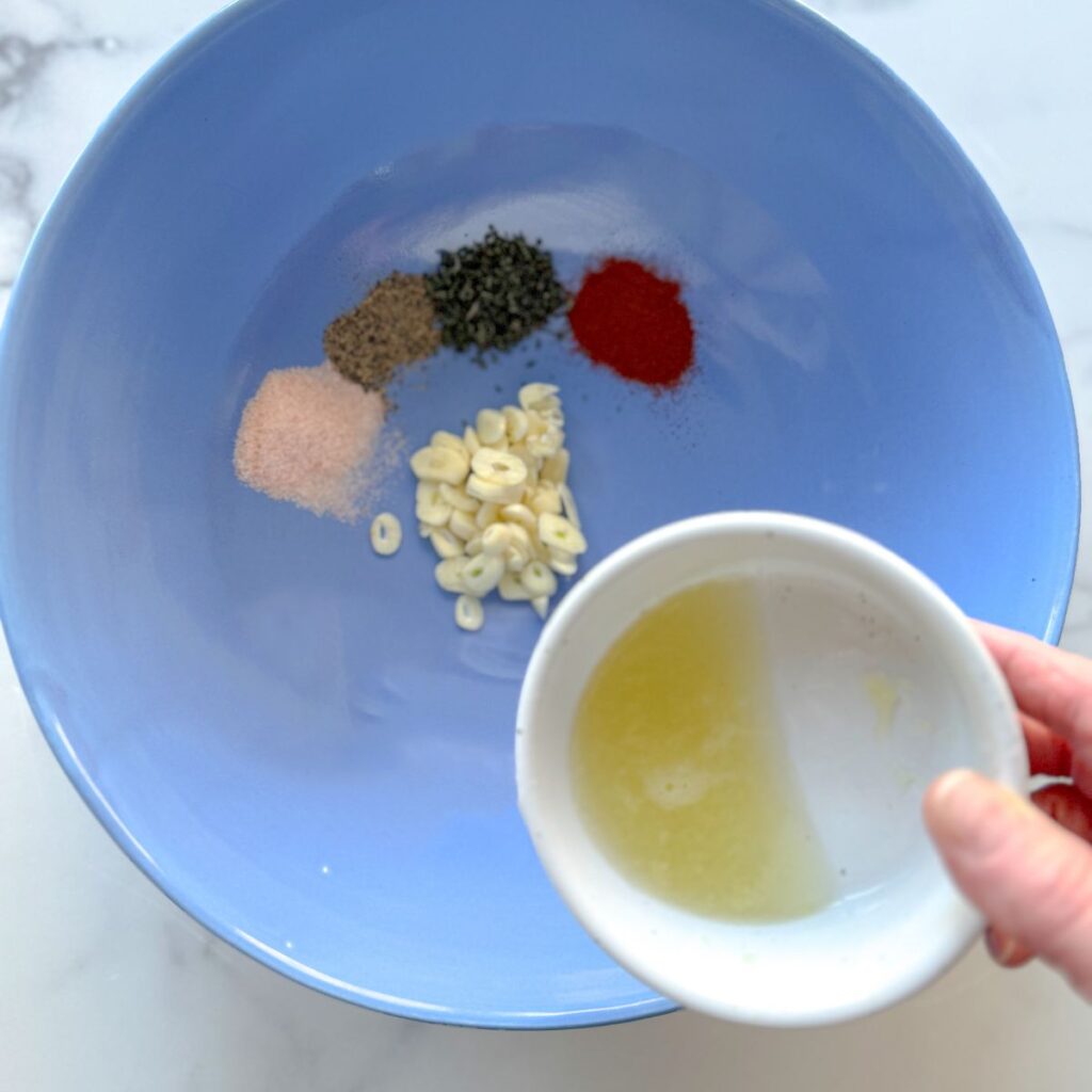 1. In a large bowl mix the chicken broth, lemon juice, garlic slices, thyme, smoked paprika, salt and pepper.