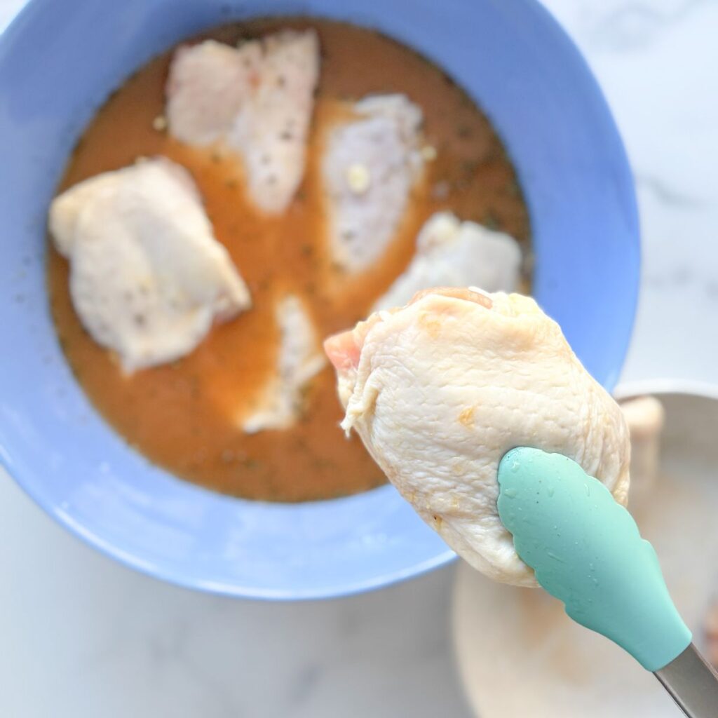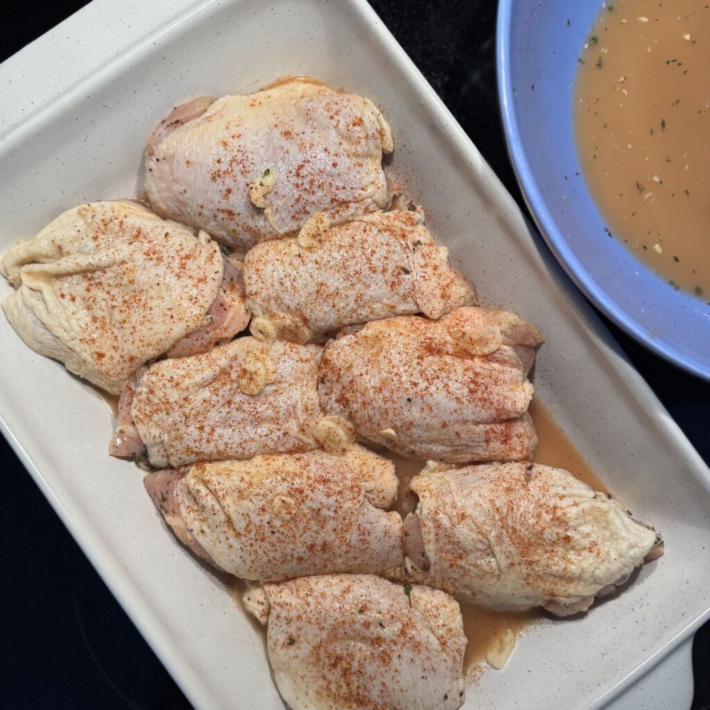 4. Move the chicken pieces to an oven safe baking dish- do not discard the marinade.