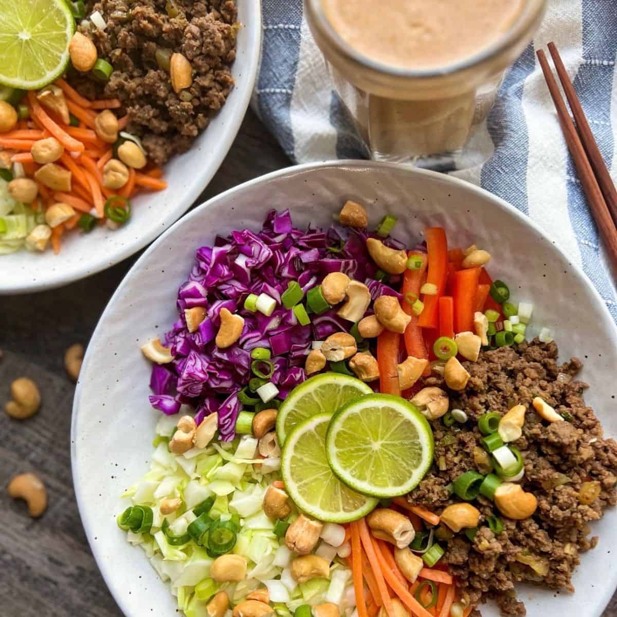This delicious Thai ground beef chopped salad is a vibrant, refreshing dish featuring quickly cooked, savory-sweet chopped beef combined with crunchy fresh vegetables all tossed in a creamy cashew dressing. If you love crunchy veggie salads try this Almond Noodle Bowl with tangy almond butter dressing.